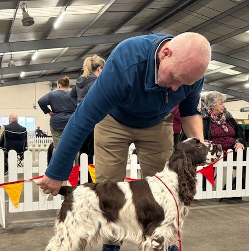 Good to go over, well constructed and sound. Kind in eye, stands on good front with shoulders well placed. Depth and strength through body even length of stride Res CC