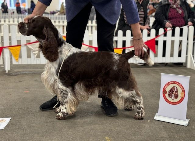 A well balanced dog with a lovely head shape Stands on a good front, with shoulders well placed. Good for length and strength through middle. Just a little bit untidy going away.